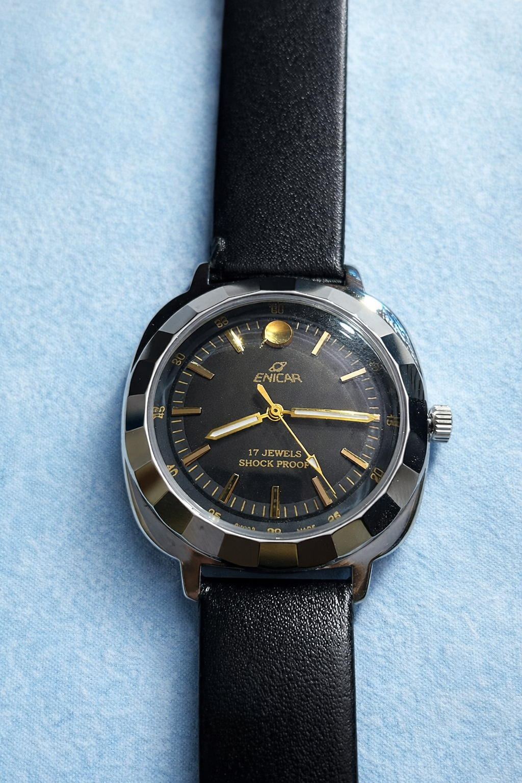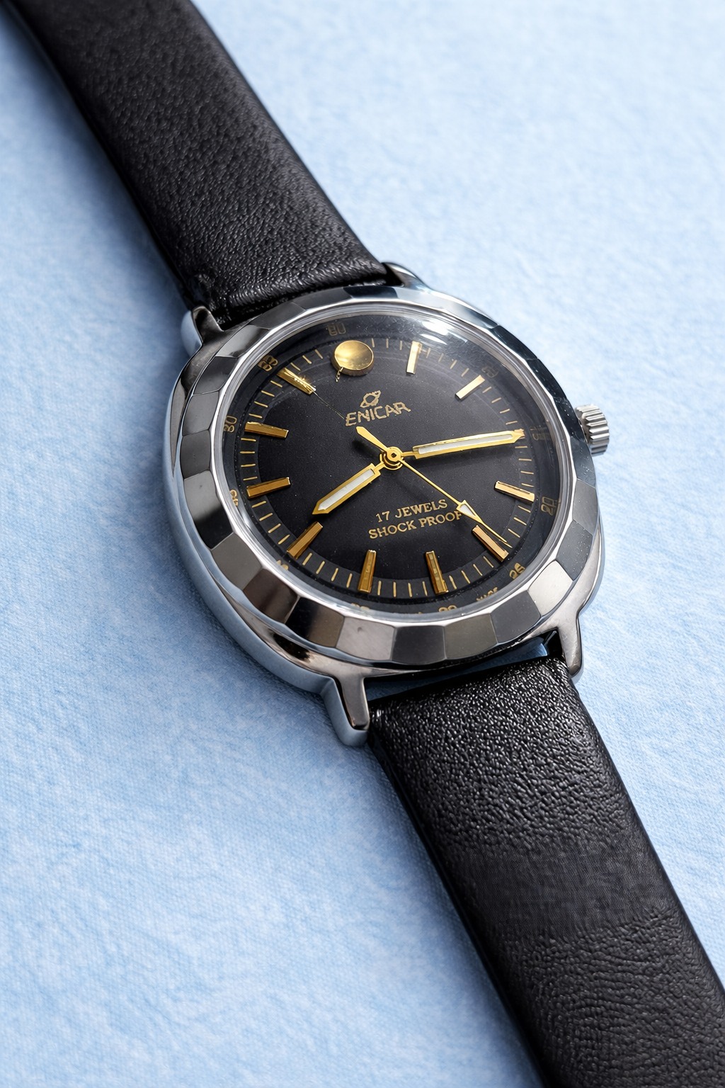 Enicar Hand Winding 17 Jewel Black Dial Men's Wrist WatchEnicar Hand Winding 17 Jewel Black Dial Men’s Wrist Watch
