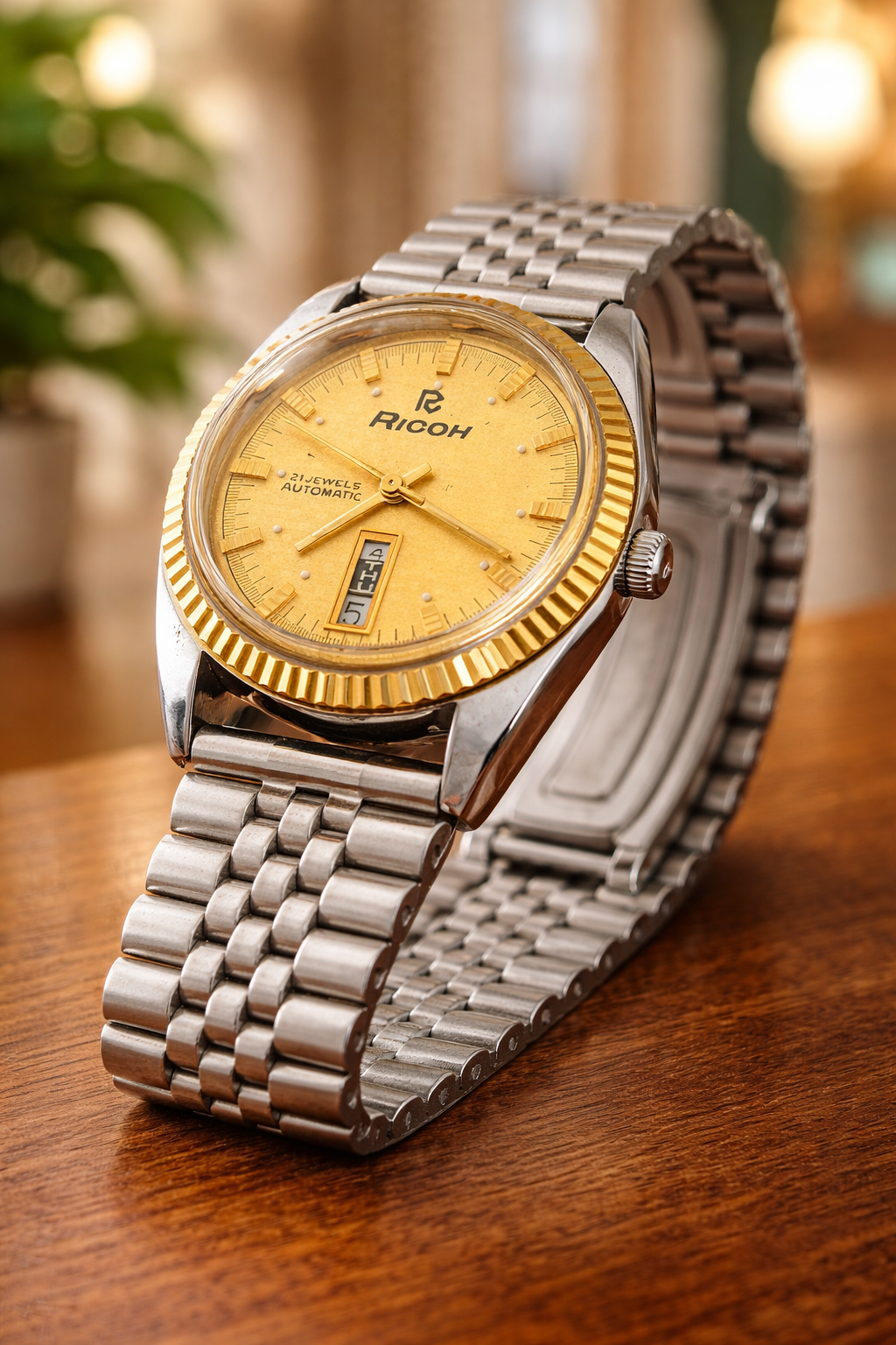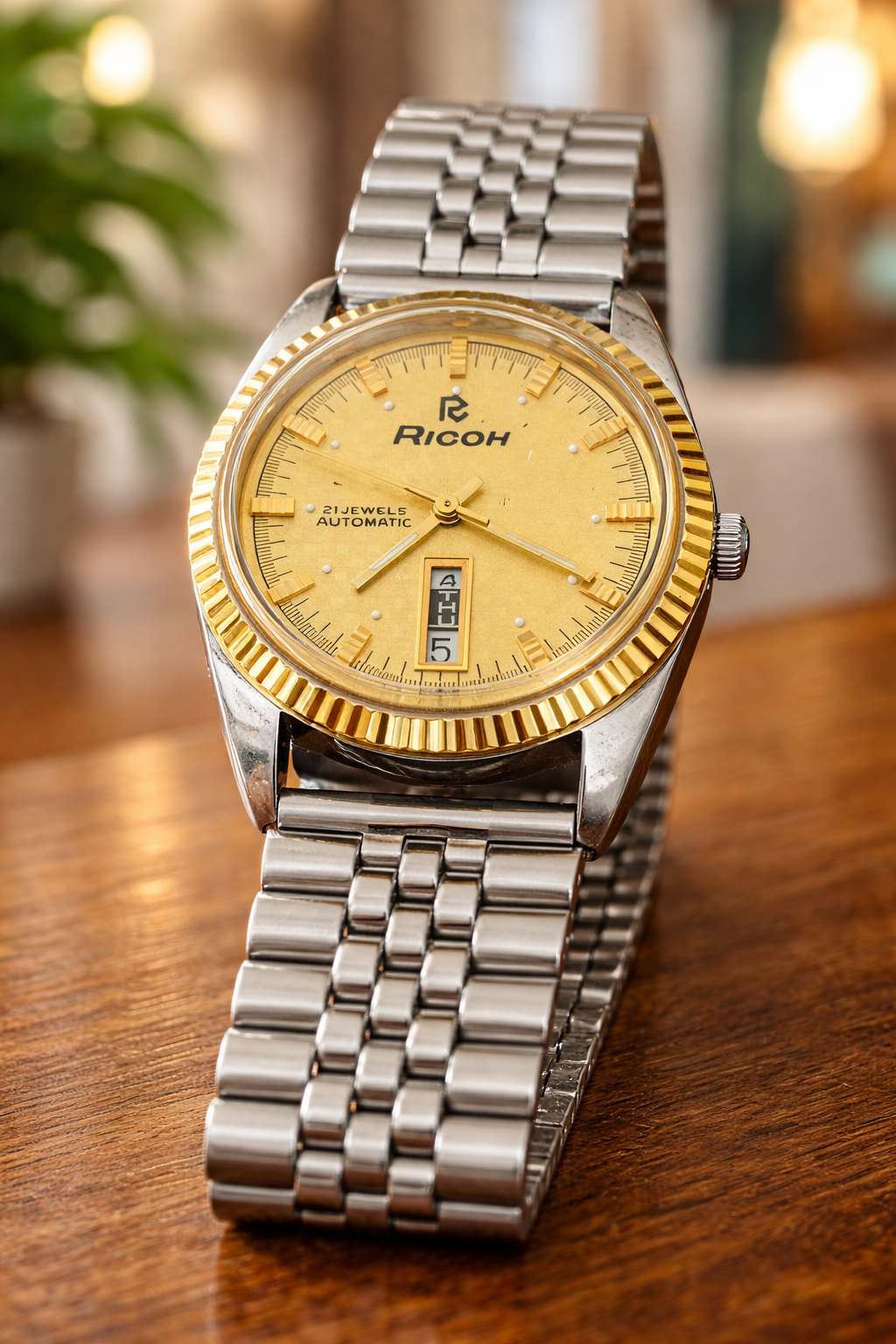 Vintage Ricoh Automatic Day/Date 21 Jewel Golden Dial Men’s Wrist WatchAvailability: 1 in stock